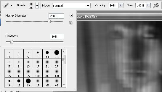 tekan Q (Edit in Quick Mask Mode) dan gunakan brush tools dengan menekan B pengaturan'a sebagai berikut.
