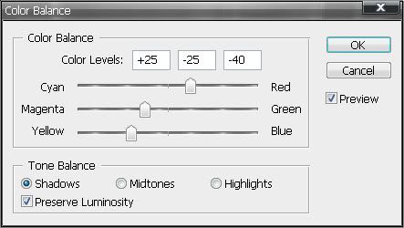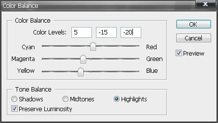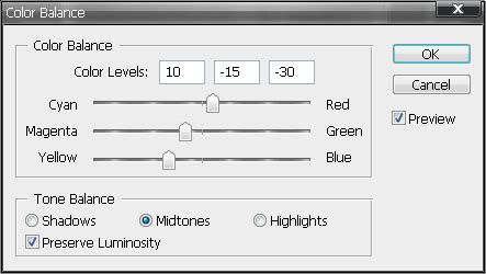 pilih menu Image->Adjusments->Color Balance atau dengan menekan CTRL+B dan atur sebagai berikut :