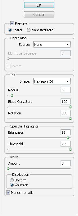 setelah itu pilih layer 1 kemudian pilih menu Filter->Blur->Lens Blur lalu atur seperti berikut :